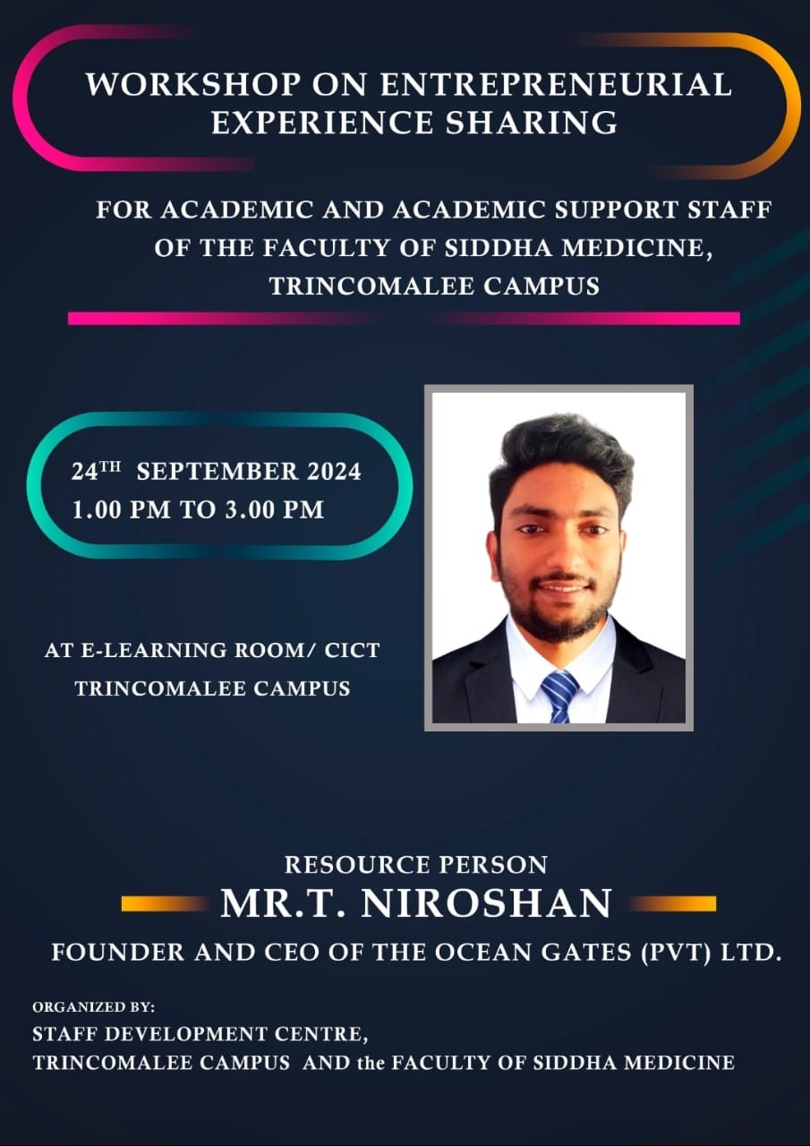 The Staff Development Centre of Trincomalee Campus, Eastern University, Sri Lanka, conducted a workshop titled “Entrepreneurial Experience Sharing” on 24th September 2024, aimed at the academic staff of the Faculty of Siddha Medicine. Held at the E-Learning Room from 1:00 p.m. to 3:00 p.m., the session featured Mr. Niroshan Thiyagarajah, Founder and CEO of Ocean Gates (Pvt) Ltd., as the resource person. He shared his entrepreneurial journey and practical insights into business development. The workshop provided valuable perspectives on innovation and entrepreneurship, supporting the professional growth and strategic thinking of faculty members.