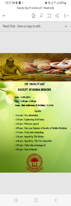 The Faculty of Siddha Medicine (FSM) held its inaugural Faculty Day and The first edition of the Faculty of Siddha Medicine Newsletter – 2023 was officially launched during the 1st Faculty Day, celebration on 14th June 2024 at 2:00 PM in the Mini Auditorium of the Trincomalee Campus, Eastern University, Sri Lanka (EUSL). The event was graced by the presence of Prof. V. Kanagasingam, Vice Chancellor of Eastern University, Sri Lanka, and Prof. C. G. Devadasan, Rector of the Trincomalee Campus. The celebration brought together academic staff, non-academic staff, and students in a shared spirit of recognition and appreciation. Faculty Day 2024 was organized to honor the dedication, hard work, and valuable contributions of the faculty over the past year